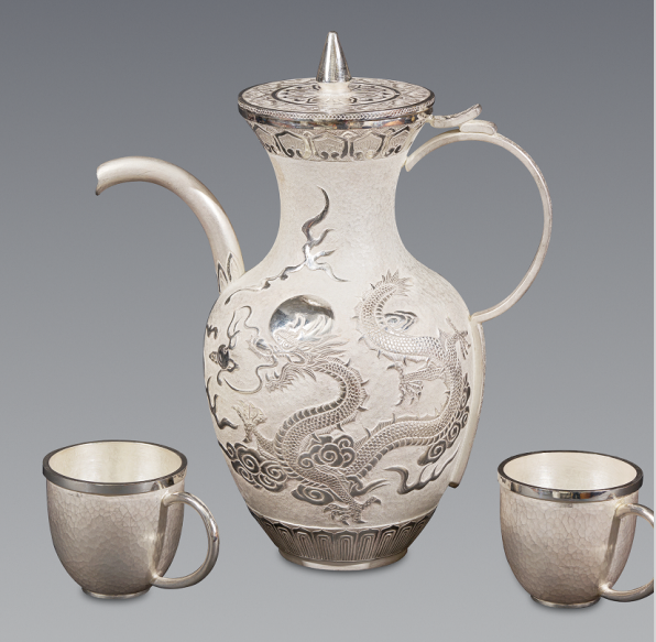 조이조각 기법으로 은 주전자에 봉황을 새겼다. 그리고 황칠나무에서 채취한 황칠을 표면에 발랐다. 황칠은 고유의 금색과 광택이 오래 지속되는 속성을 갖고 있다.