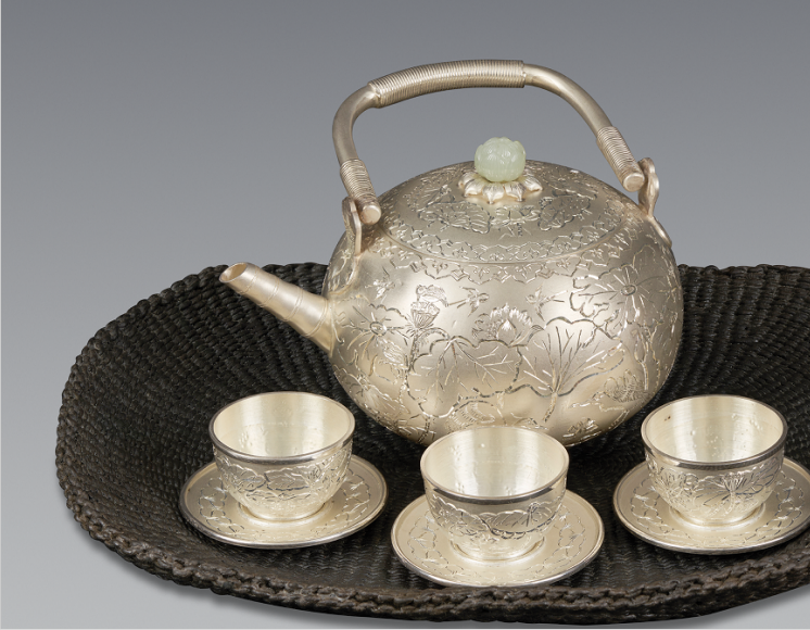 조선시대 궁궐이나 사대부의 집안에서 사용되었을 법한 고급 식기 세트를 은으로 재현했다. 금부 기법을 적용했다.
